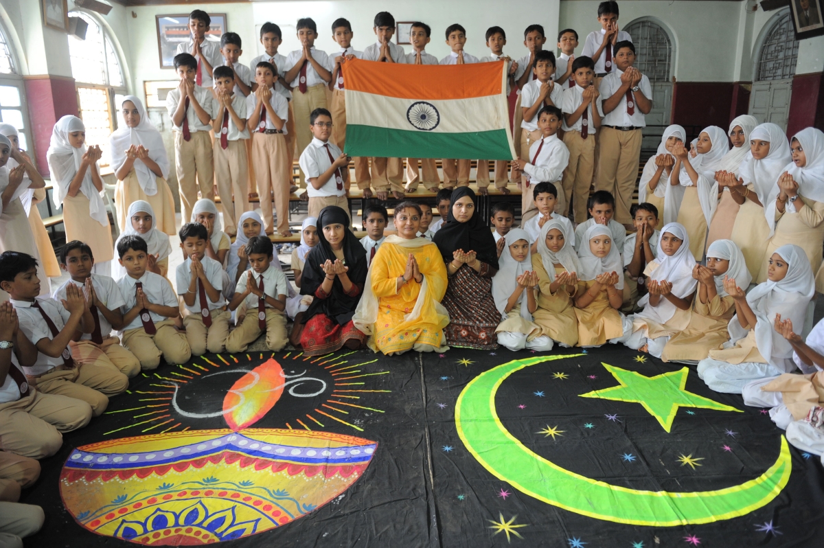 Students and teachers from Anjuman-E-Islam school pose with Hindu and Islamic religious designs. 2010. Facebook,
